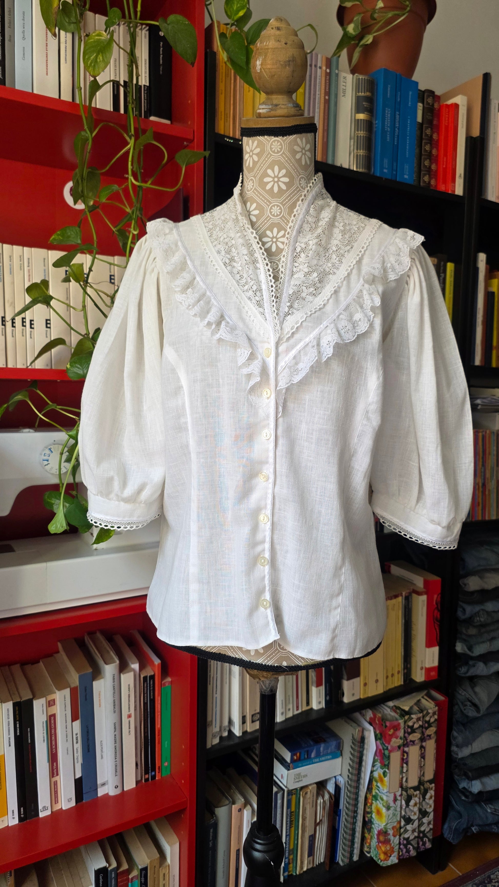 In misto cotone. Segna una 44 ma veste meno, massimo una 42. Bellissima già da una S. Maniche a palloncino fino al gomito, pizzo.