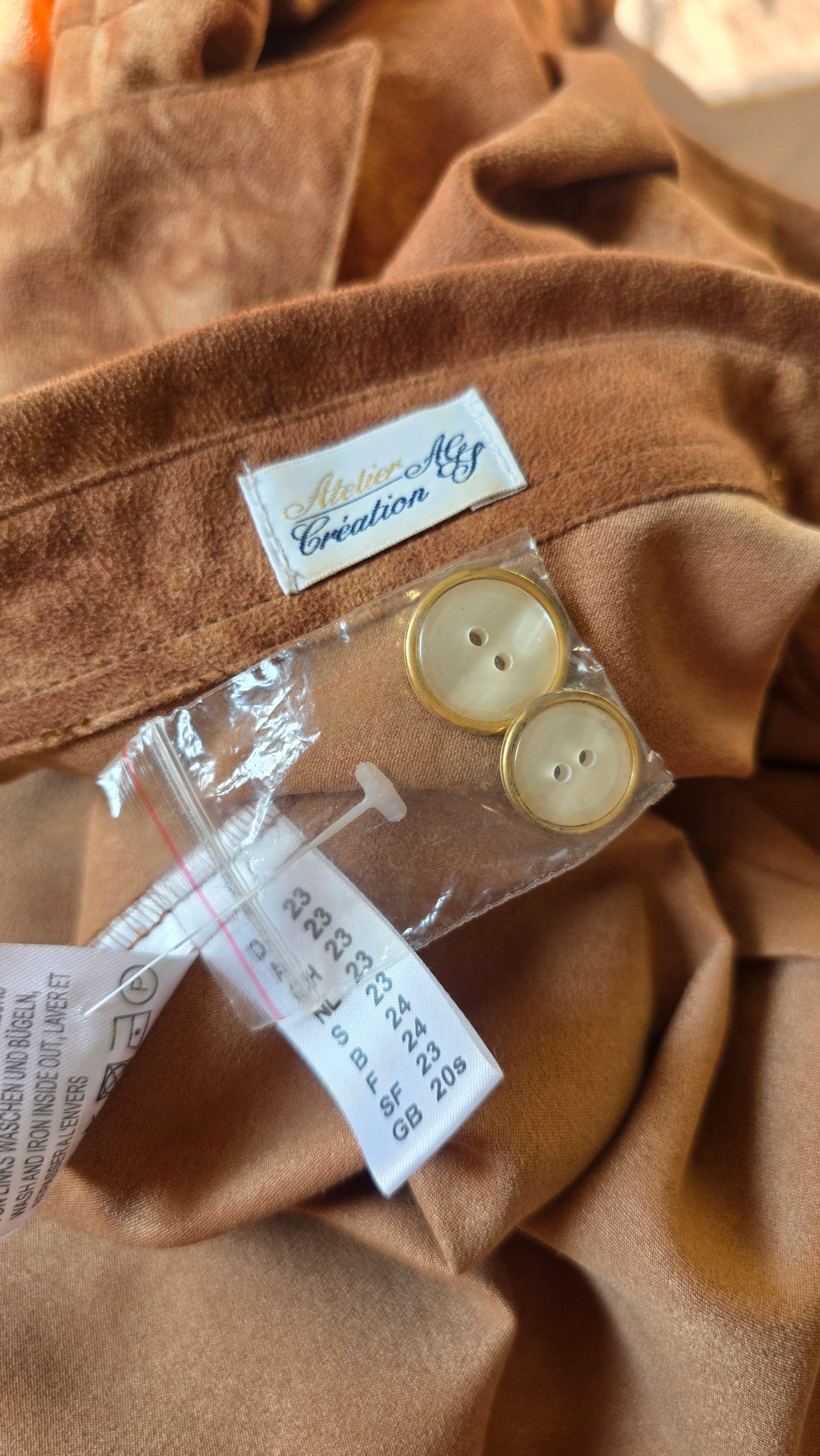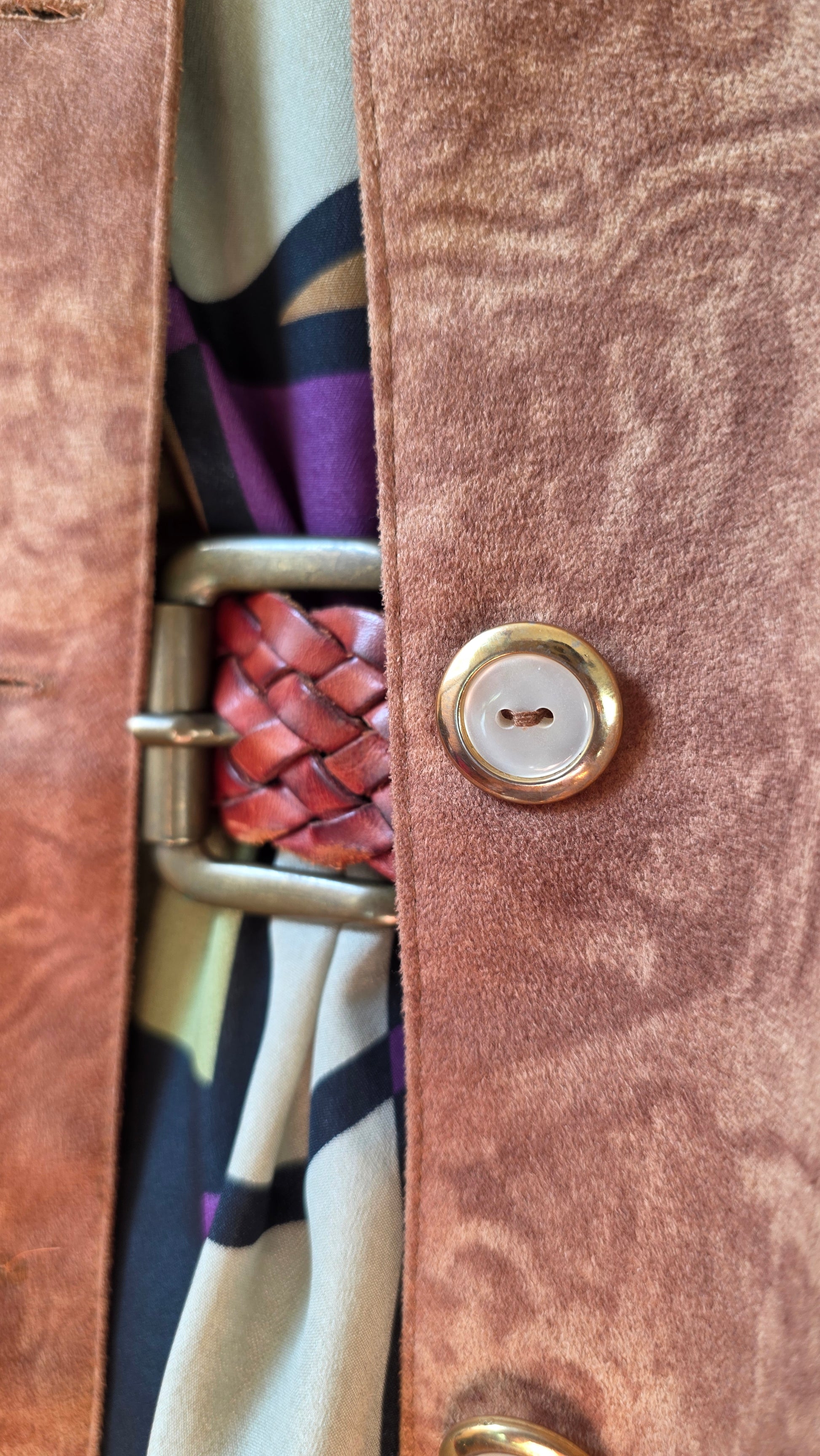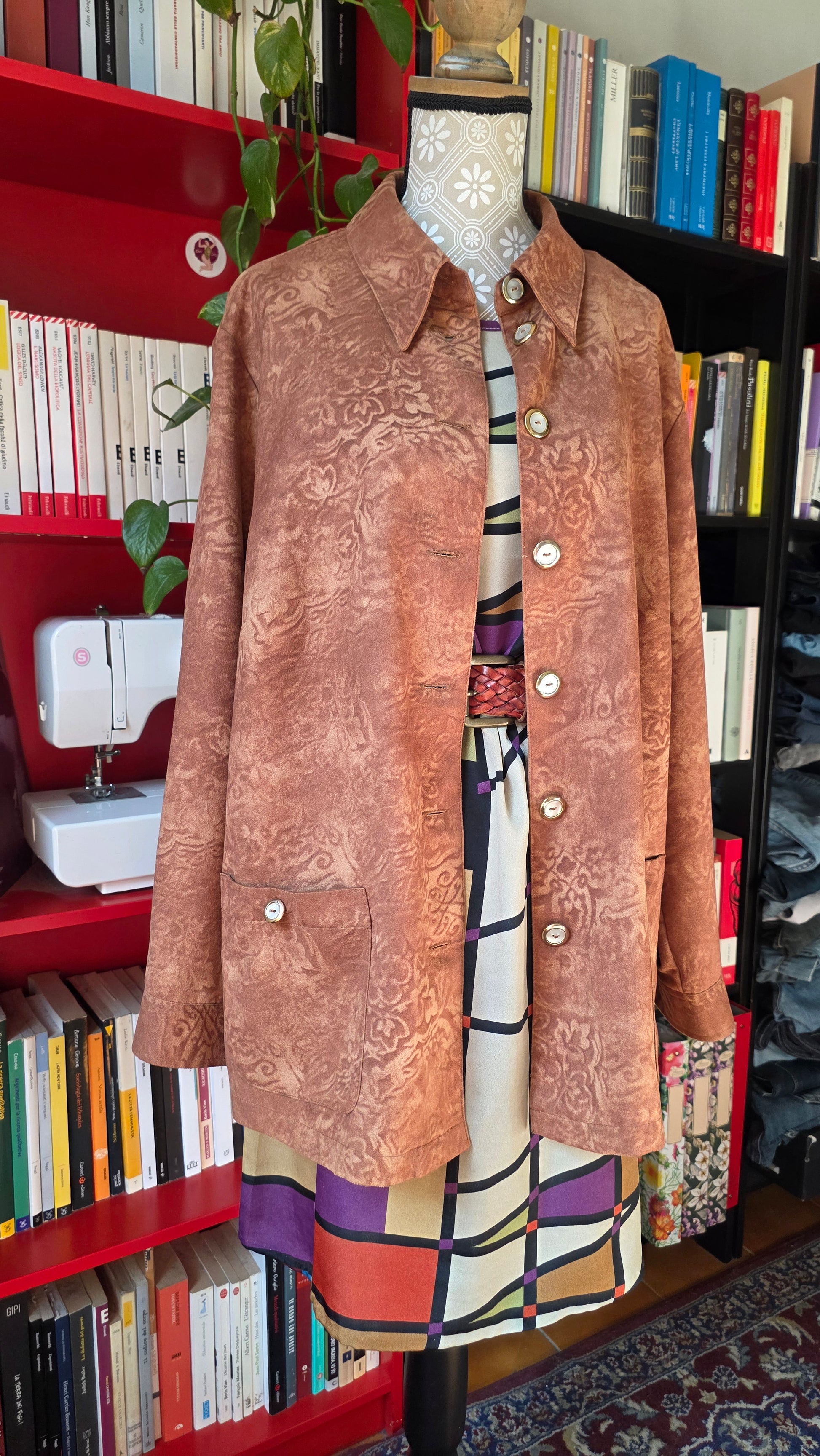 In simil camoscio, con fantasia damascata. Una vera chicca. Veste fino a una M. Stupenda oversize su taglie più piccole. Bottoni di ricambio all'interno