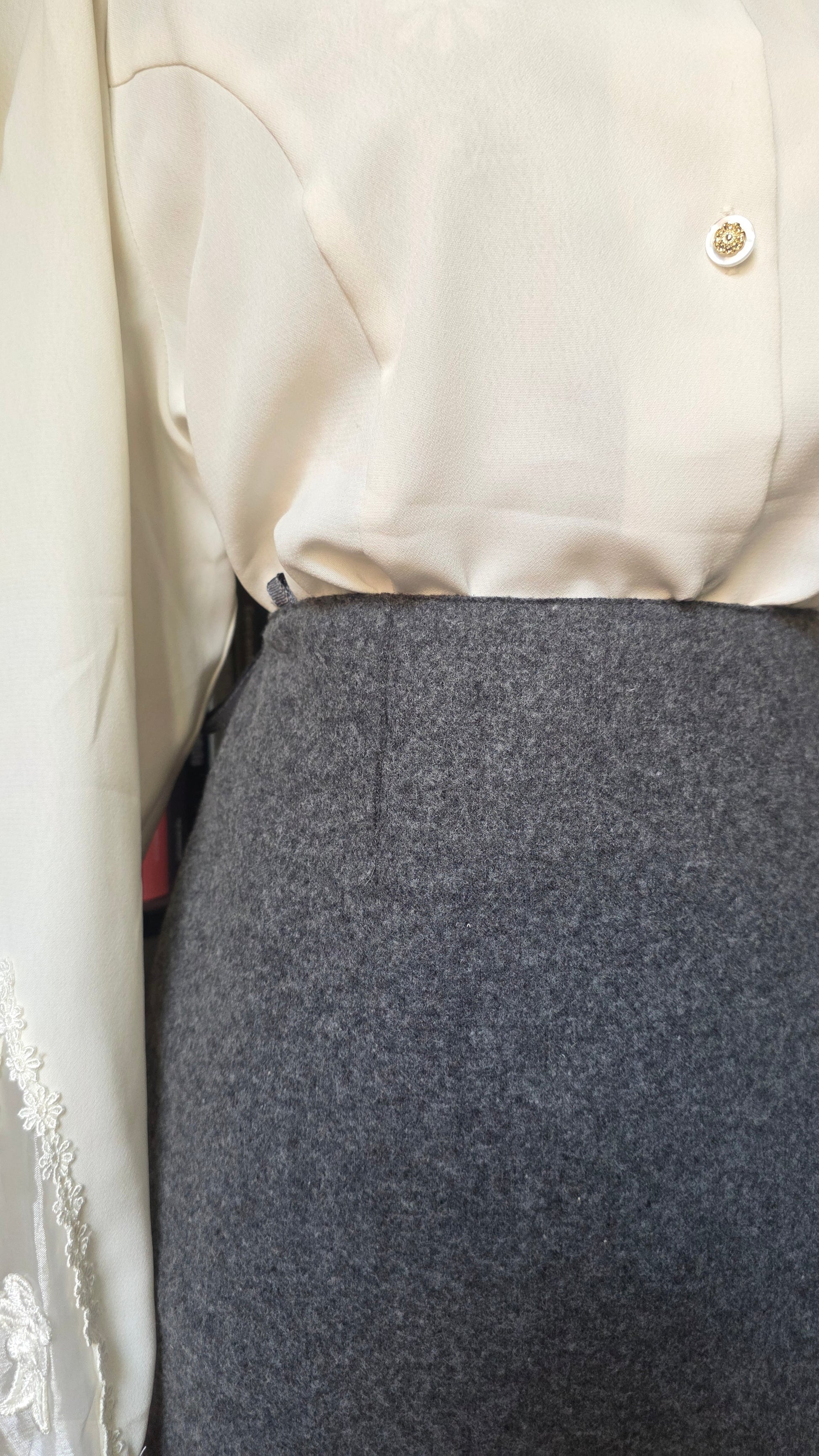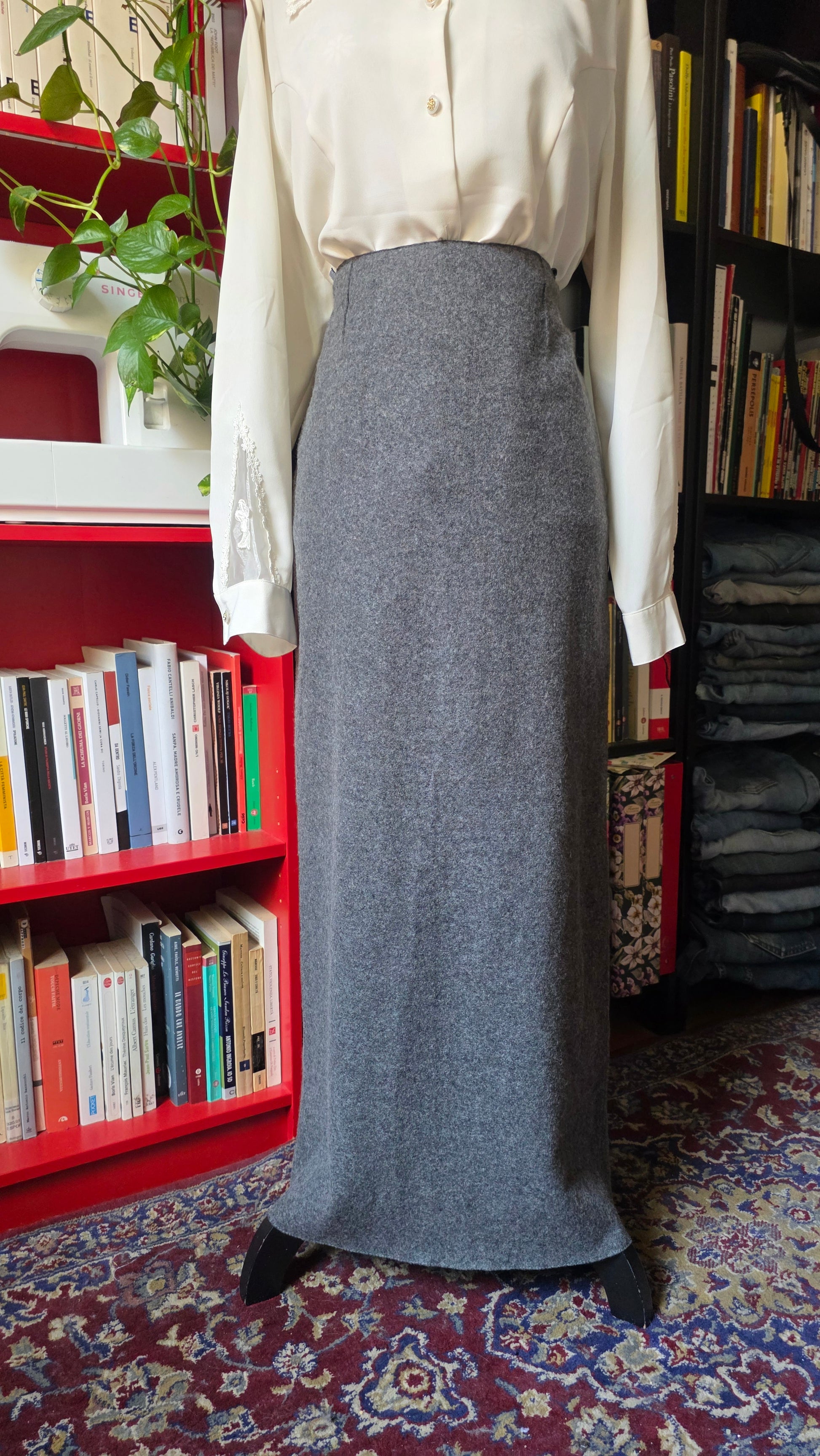 In 80% lana con fodera interna. Ottime condizioni. Vita 72 cm, fianchi max 102 cm, lunghezza 91 cm. Consiglio a una 40/42