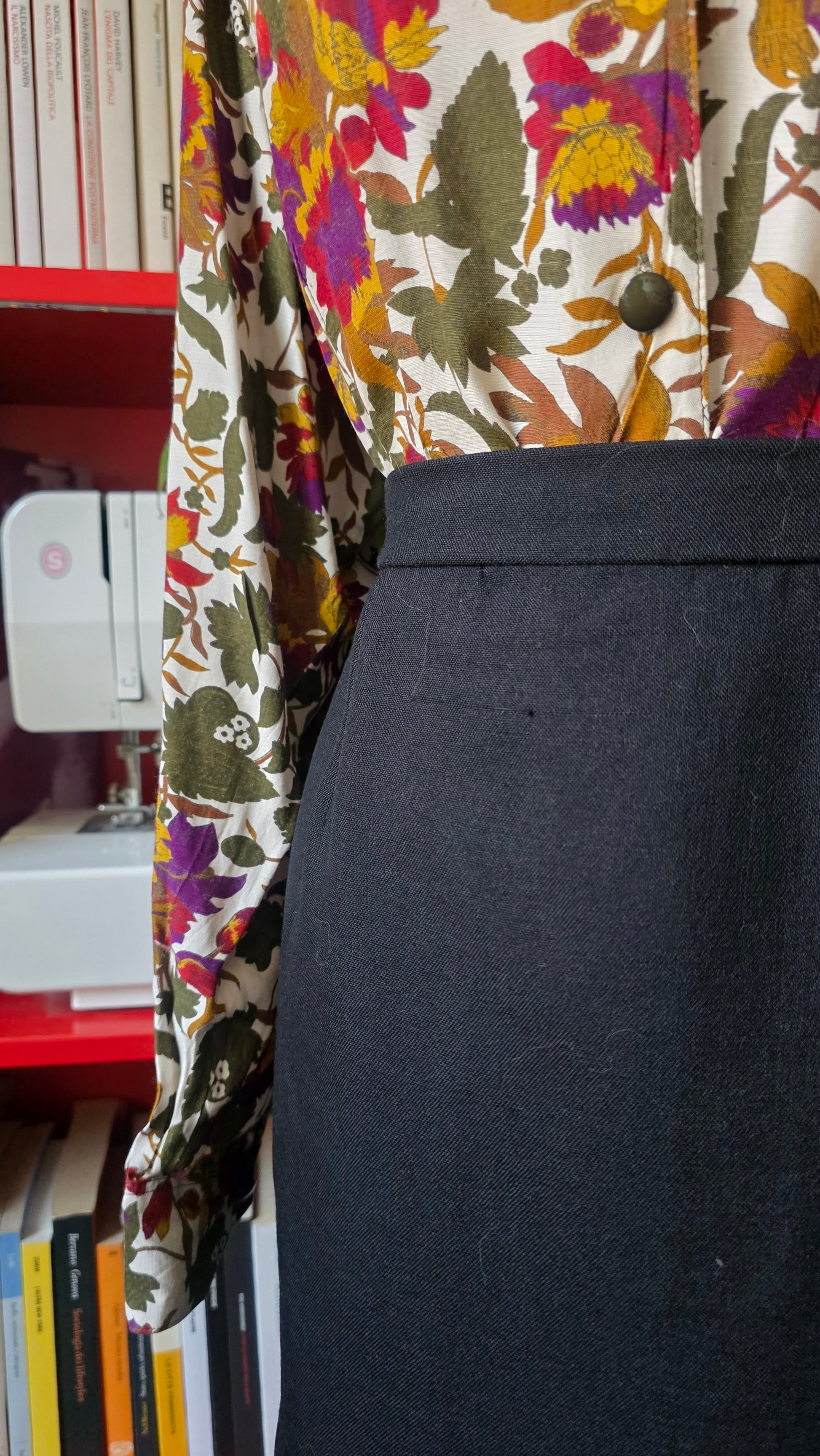 Perfetta con tutto, sartoriale. Vita 70 cm, lunghezza 41 cm. Consiglio a una S/40. Al tatto lana con fodera interna viscosa.