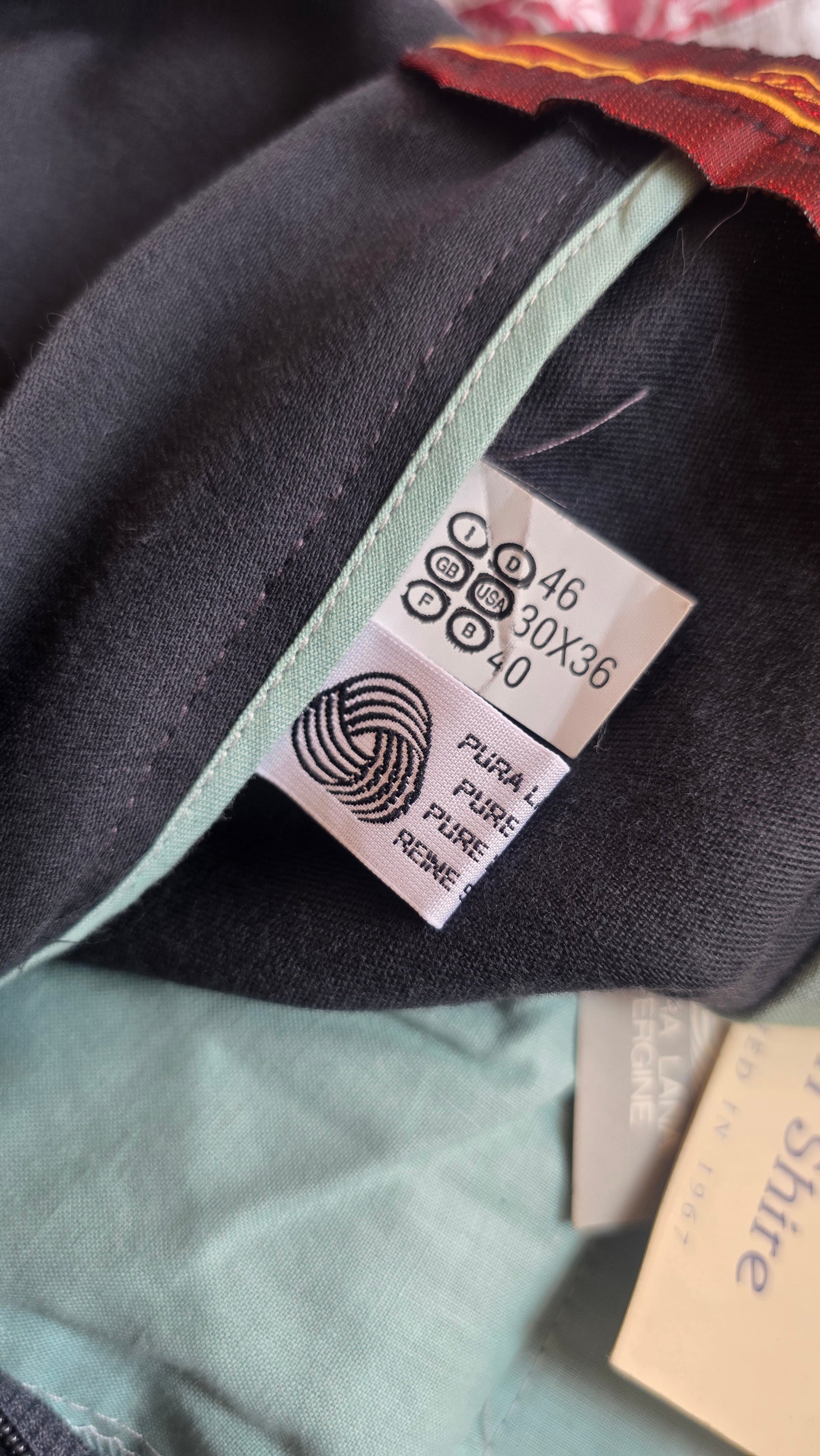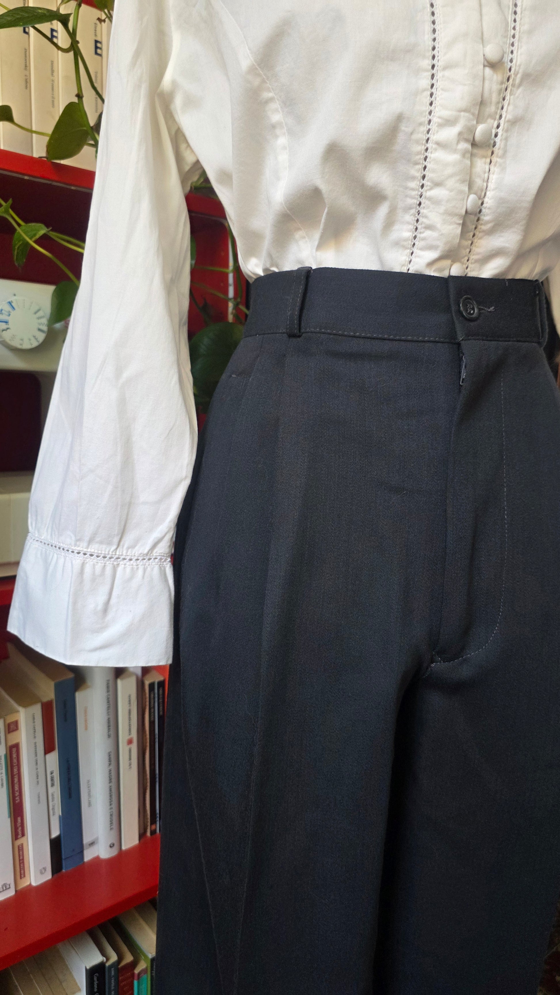 Taglio e modello maschile, gamba ampia. New old stock. In lana vergine di altissima fattura. Il colore è un bellissimo grigio scuro. Con tasche e pinces. Vita 79 cm, fianchi 110 cm, cavallo 30 cm. Come i classici pantaloni da completo, hanno l'orlo libero.
